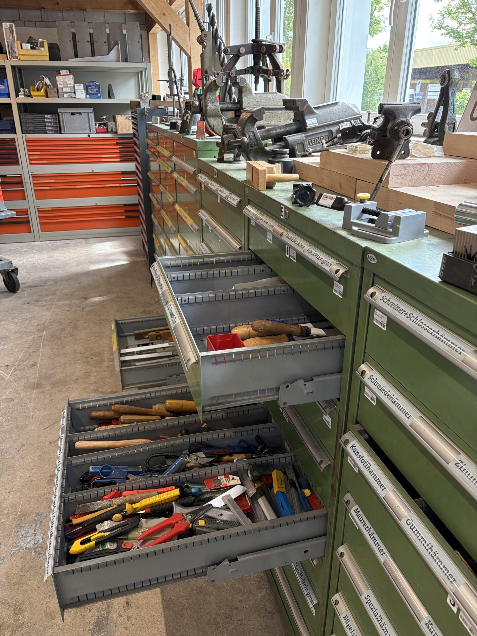 Werkstatteinrichtung – Schubladenstöcke, Werkbänke, Gestelle, Schränke, Abfalleimer, Böcke, Leitern, div. Lista Artikel, Tischbeine…